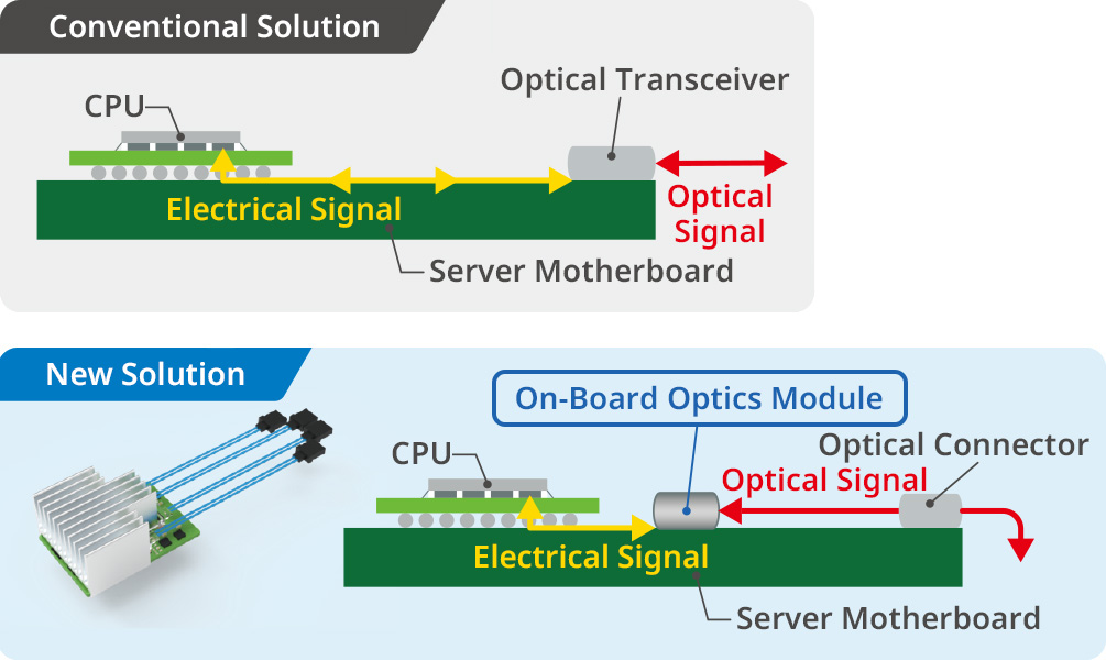 As the adoption of AI and digital transformation accelerates, the need for high-speed, high-capacity communication in data centers and network equipment is growing exponentially. To meet this demand while reducing power consumption, technologies that replace conventional electrical signals with optical signals are increasingly drawing attention. Kyocera is leveraging our proprietary technologies in wiring boards and optics to develop a new "On-Board Optics Module" device that converts electrical signals into optical signals for high-speed transmission and reception. By converting electrical signals from sources such as CPUs into optical signals at an early stage, Kyocera's device significantly reduces wiring loss. This innovation has led to a world-first achievement: a transmission bandwidth of 512 Gbps, compliant with the PCIe® 5.0 standard.* This breakthrough will contribute to faster and more energy-efficient data centers and network equipment, paving the way for high-performance digital infrastructure of the future. *Among products compatible with the PCI Express Gen 5 expansion interface standard. (Kyocera research, as of September 2022) *PCIe® is a registered trademark of PCI-SIG.